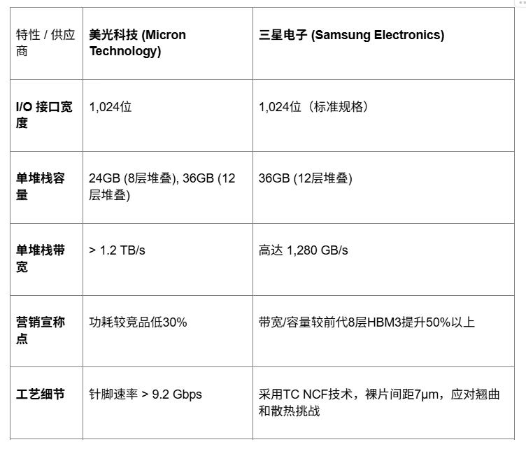供应商发布的产品规格凸显了HBM的技术特性和竞争焦点。以下是美光与三星近期HBM3E产品的对比:
