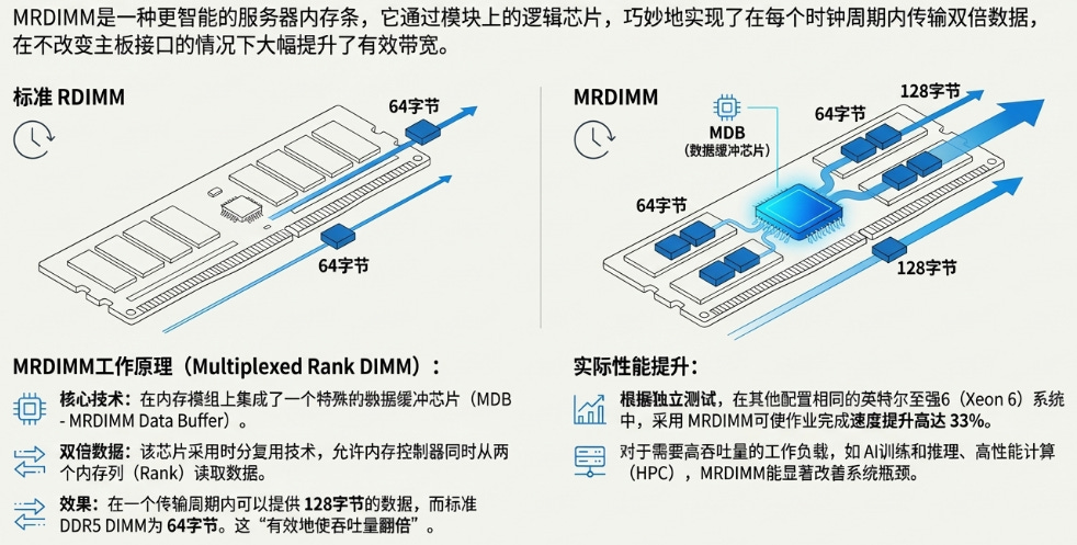 工作原理:MRDIMM在与现有RDIMM相同的接口和外形尺寸下,通过在模组上集成缓冲和多路复用逻辑芯片(如Montage的MRCD/MDB芯片),实现了对两个内存秩(rank)的同时操作。这种机制能够在一个时钟周期内传输128字节数据,而标准DDR5 DIMM只能传输64字节,从而“有效倍增”了吞吐量。
