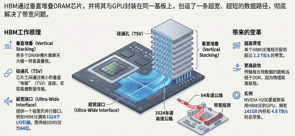 HBM技术通过垂直堆叠多个DRAM裸片,并采用一个极宽的并行接口(通过基底裸片和高密度互连实现),从根本上解决了传统DDR内存面临的带宽瓶颈。其核心优势在于,相较于在长距离电路板走线上提升信号速率,HBM通过缩短物理距离和扩大接口宽度,实现了无与伦比的每瓦带宽和每封装面积带宽,这对于功耗和空间受限的AI加速器至关重要。
