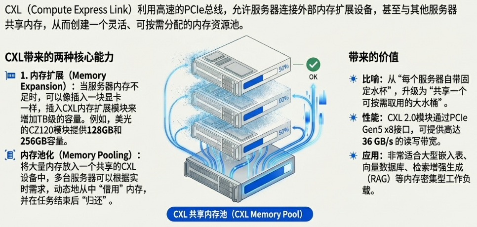 CXL(Compute Express Link)是一种基于PCIe物理层的高速互联标准,它为服务器内存系统引入了一个全新的扩展维度。CXL的定位并非要取代DDR作为主内存,而是作为一个补充性的容量层和资源池化层,以应对特定工作负载对海量内存的需求。