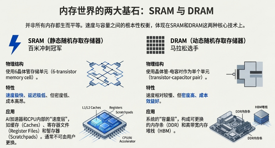 SRAM(静态随机存取存储器):作为“片上高速层”,SRAM通常由6个晶体管构成一个存储单元,被部署在CPU或GPU芯片内部,用作寄存器、高速缓存和暂存器等需要极低延迟的结构。由于其面积成本高、密度低,SRAM通常不作为用户可更换的独立组件。在AI系统中,它是确保核心计算单元能以最高速度获取数据的关键。