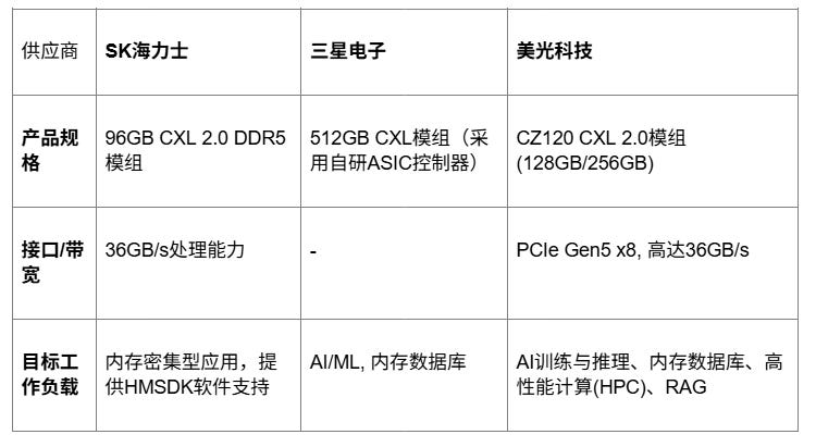 各大内存厂商正积极布局CXL产品,其规格和目标应用场景如下表所示:
