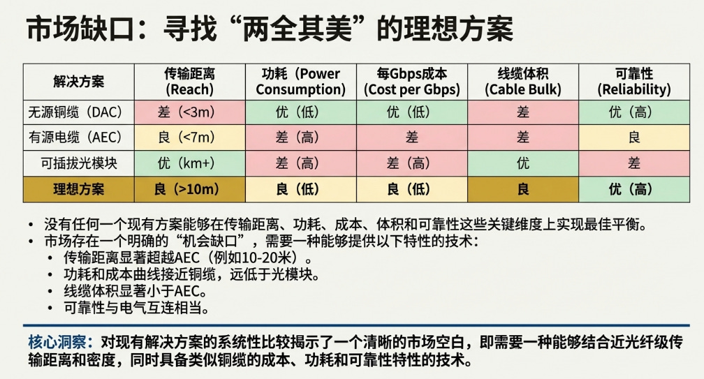 为了应对“铜崖效应”带来的挑战,业界已经部署了多种互连解决方案。本节的战略重要性在于,通过系统性地评估每种方案的优缺点,我们可以清晰地揭示出一个独特的机会缺口,即当前市场未能有效满足的需求集合,这为颠覆性技术的出现提供了坚实的理论依据。