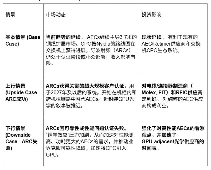 近封装/共封装GPU光学 (Near-Package/Co-Packaged GPU Optics): 这是主要受威胁的领域。如果导波射频在2027-2028年被证明“足够好”且比光学方案更可靠,它可能会延迟或减小该特定应用的TAM,推迟“光进铜退”在GPU封装上的最终实现。