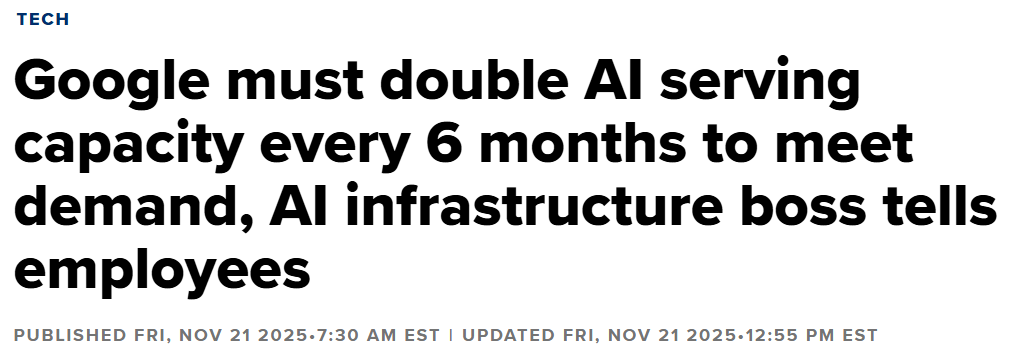 在当前的“产能受限时代”,供应商多元化往往是确保供应链弹性的战略必然。根据谷歌高管在内部会议上的表述,公司计划每6个月将AI服务能力翻倍。这种近乎疯狂的扩张速度,早已超出了单一供应商的物理产能上限。